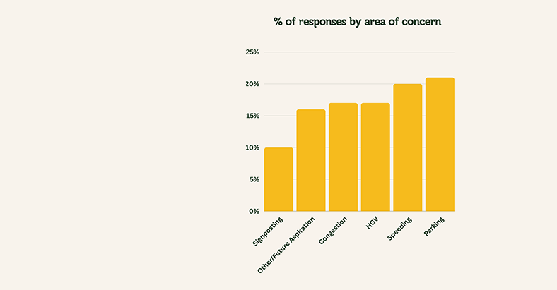 114 local residents from 61 unique postcodes gave 405 responses (forms) to the categories, HGVs, parking, signposting, speeding and other / future actions. They were asked to identify locations of concern and the time of day at which they occur, describe the concern and why it was a problem and to rate the impact, priority and urgency.